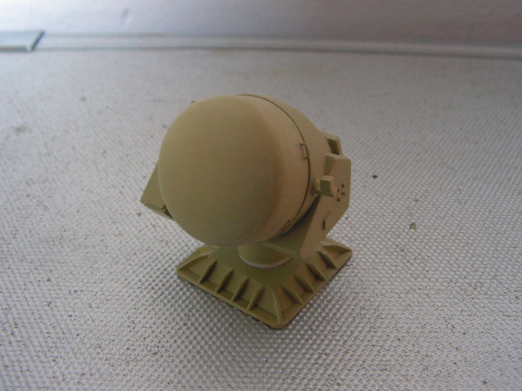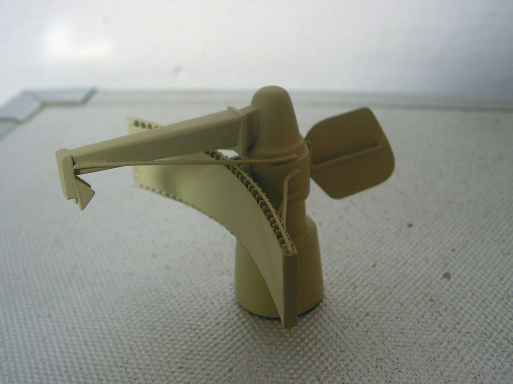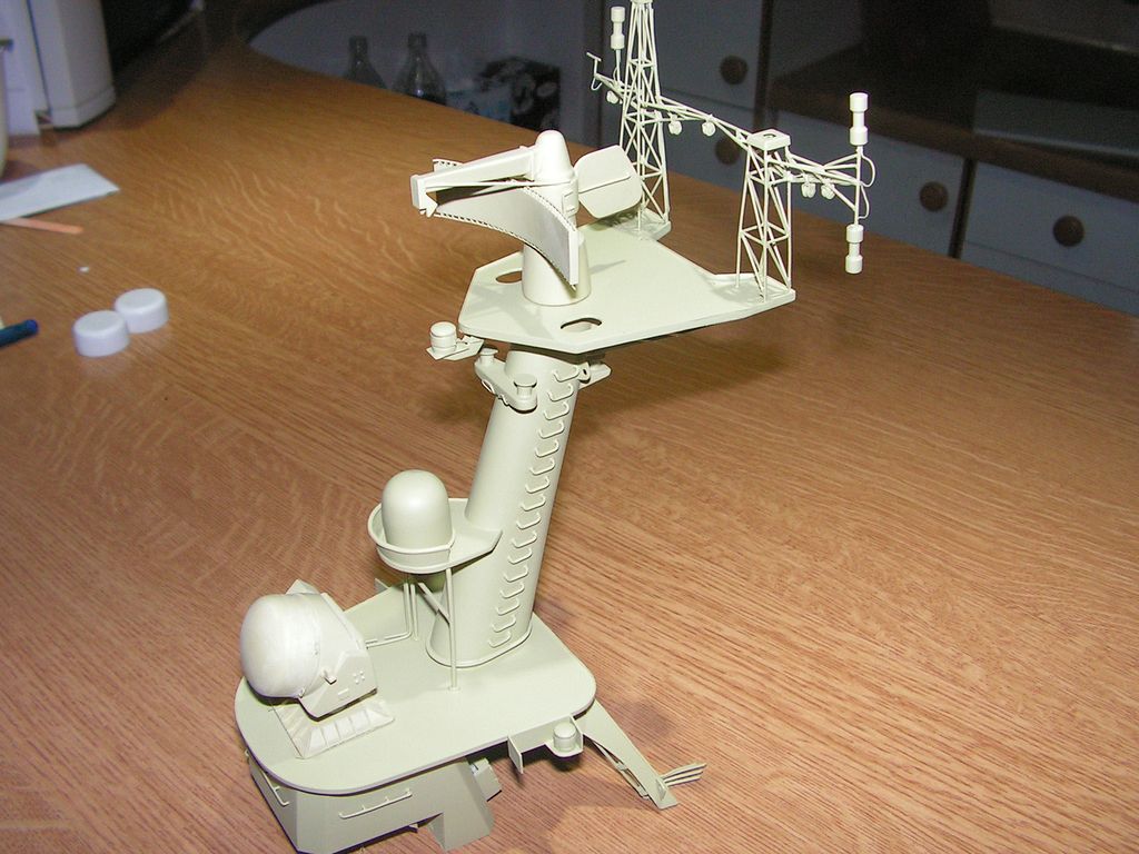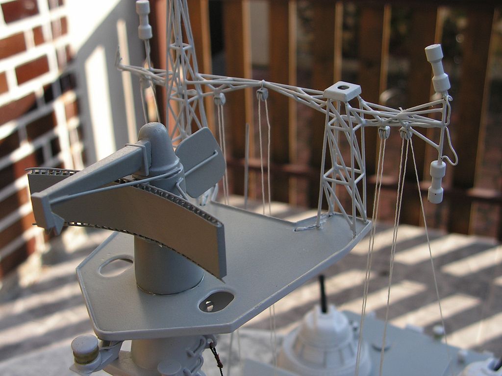 Základna stožáru je opět z laminátových desek 0,76 mm. Samotný stožár je vybroušený z extrudovaného polystyrenu podle šablon, olaminovaný třemi vrstvami tkaniny cca 80 g. Po olaminování jsem polystyren odleptal pro jednodušší protažení kabelů pozičních světel. Horní platforma je z kombinace laminátových desek 0,76 a 0,2 mm. Vyhledávací radar „garpun“ má tělo vysoustružené ve vrtačce z násady od smetáku a parabolu slepenou na šabloně z pásků laminátu 0,2 mm.