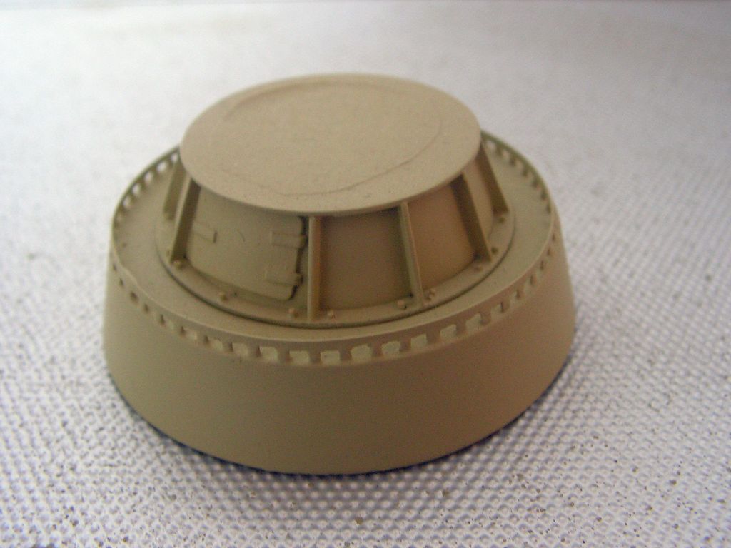 Podstavy se mi ani na několikátý pokus nedařilo udělat z HPS (je to dost uzavřený tvar a výpary rozpouštědlového lepidla provedly s pláštěm své), proto je kostra z laminátových desek a pouze plášť z HPS, lepený vteřinovým lepidlem. Věž je vybroušená z jednoho kusu HPS (vrstvené desky 1 mm). Ani několik pokusů o domácí odlití nevedlo ke zdárnému cíli (nedařilo se mi ze složitějších tvarů vypudit bubliny), proto jsem věž odeslal Petrovi Hájkovi (ufon), který odlil věže v perfektní kvalitě. Na této sestavě bylo nejnáročnější vytvoření zábradlíčka kolem podstavy. Toto zábradlíčko je vyřezávané z laminátu 0,2 mm a má výšku 2 mm.