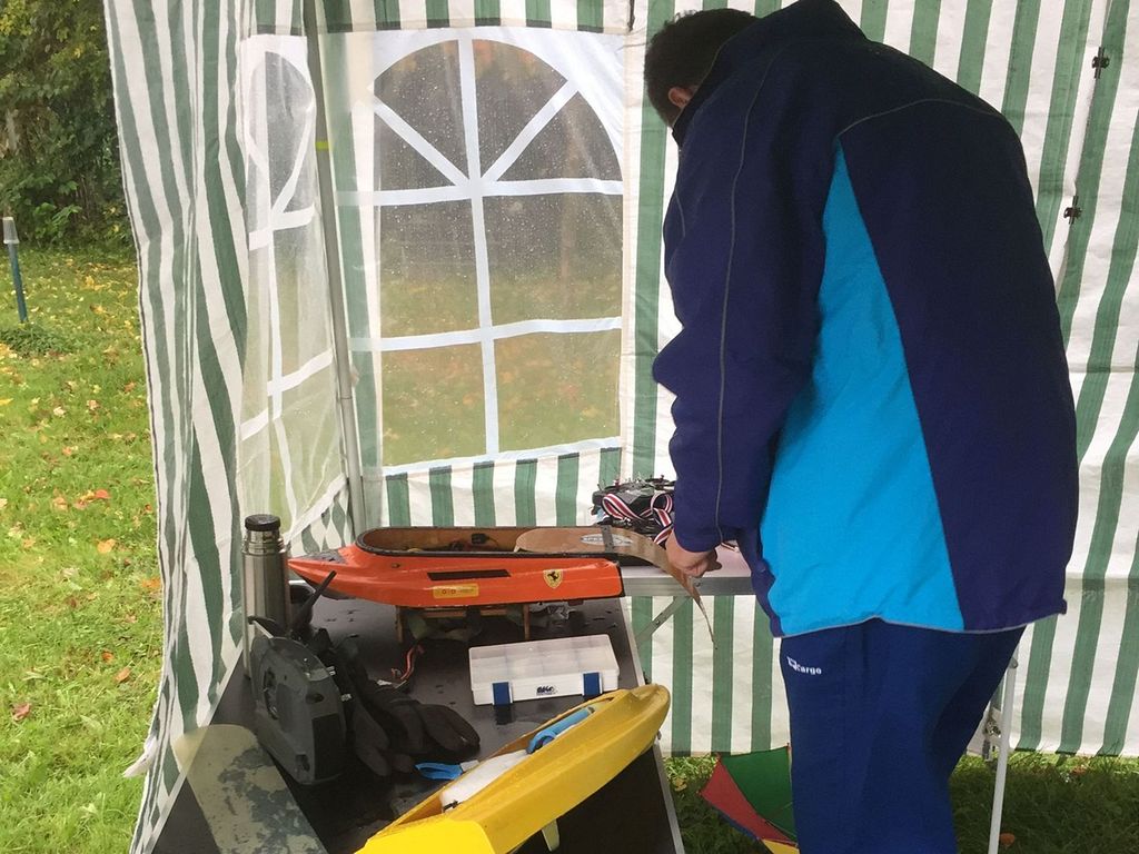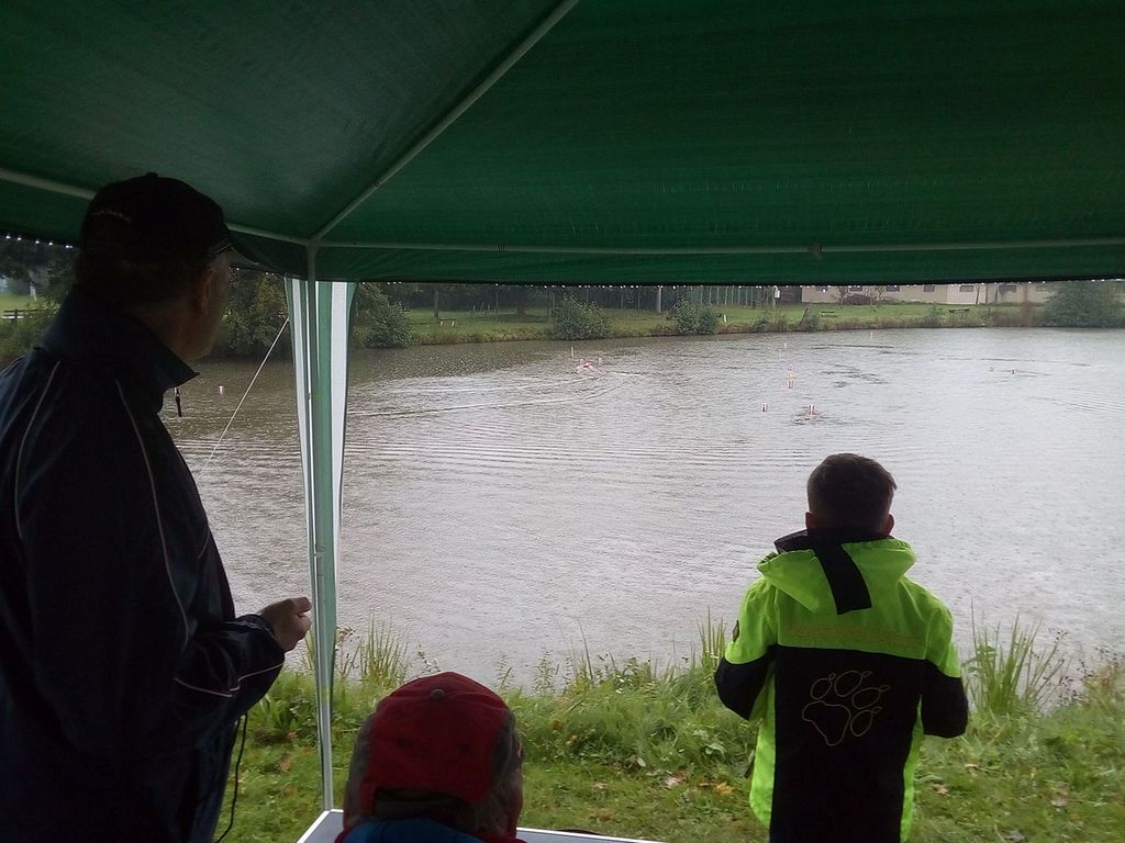 Ještě jsem se zapoměl zmínit o dalším příznivci lodičkářů, který nás na Laši i v tom nepříznivém počasí navštívil. Jméno bohužel neznám. Sám je sice leteckým modelářem, ale naší soutěže využil k odzkoušení svého rychlostního modelu F1E, se kterým, po domluvě, několikrát brázdil hladinu rybníka. Všichni jsme byli mile překvapeni, jak model na vodě pěkně sedí a za rychlost se nemusí vůbec stydět. Jen nás mrzelo, že se kolega nenechal zlákat do naší soutěže. Snad příště.