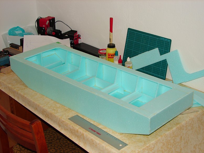 Konstrukci jsem slepil Purexem Rapid z podlahářského 6mm silného depronu a řádně zajistil proti průhybu a zkrutu. Je olaminována EPOXY 1200 v asi 2mm silné vrstvě. stěny jsem nechal podložené depronem a všechny příčky opatrně vylámal. Následovalo mohutné tmelení a přísaha, že trup lodě už laminovat nikdy nebudu.
