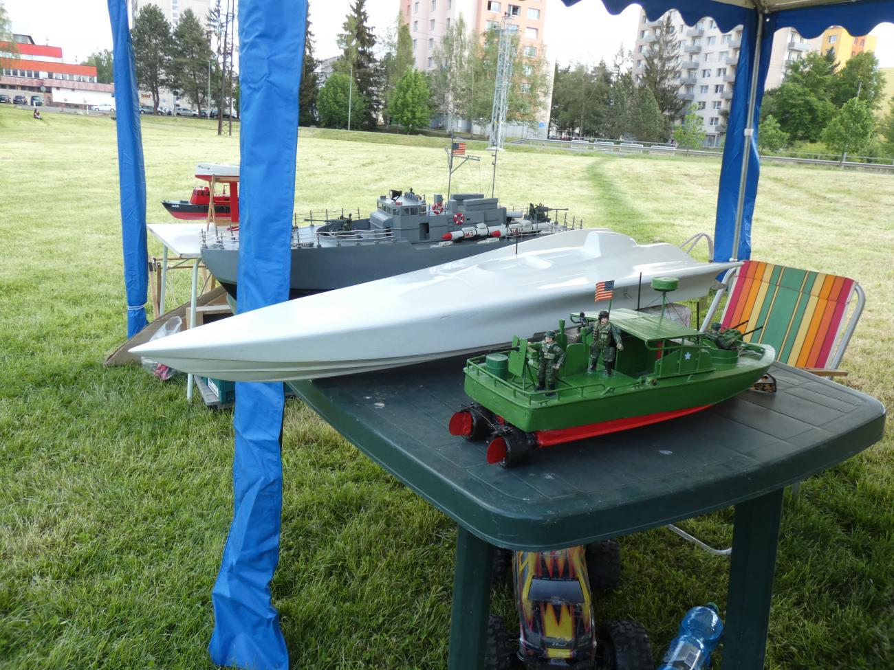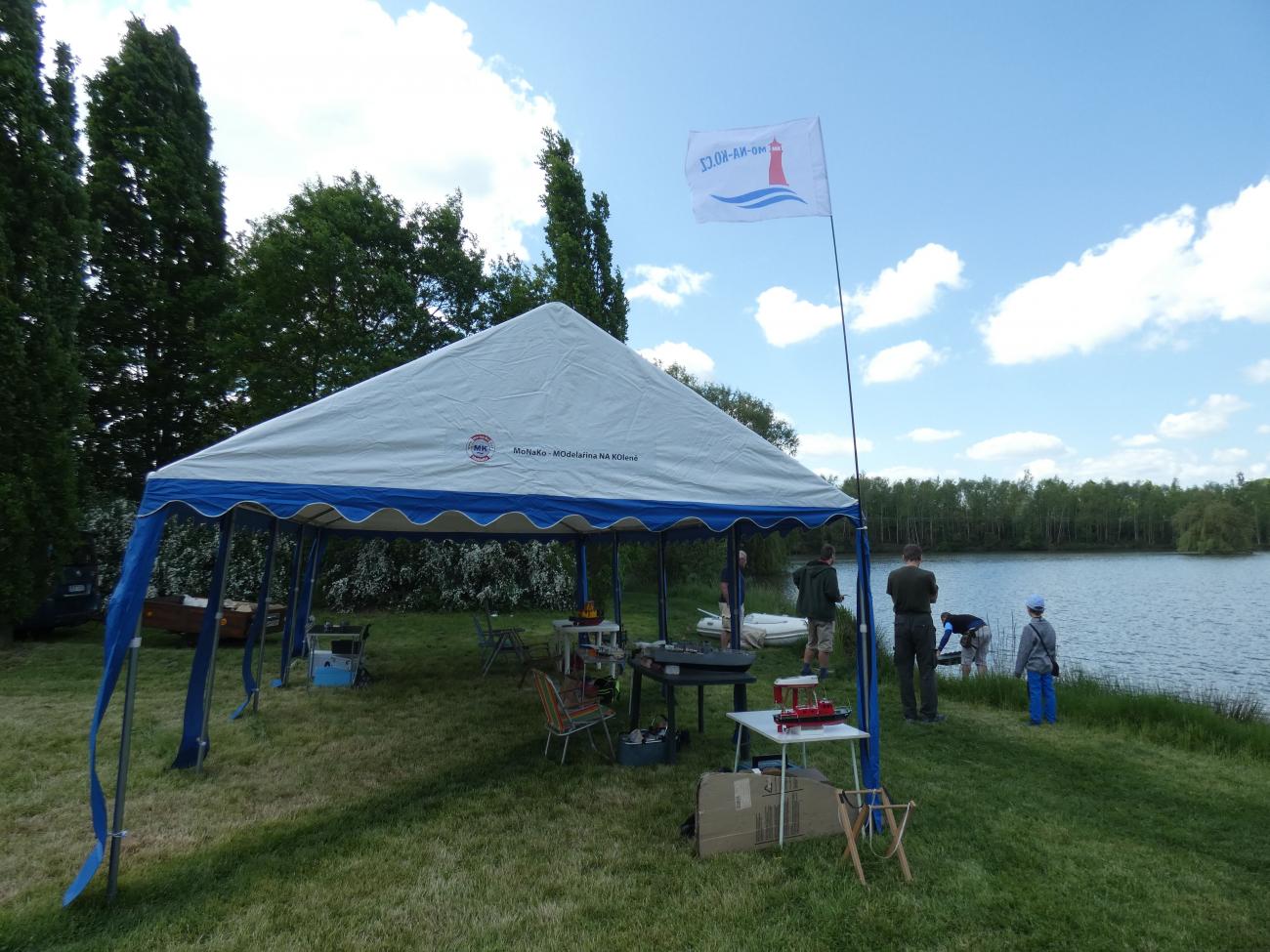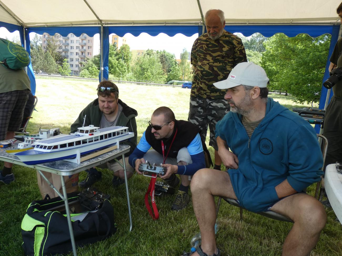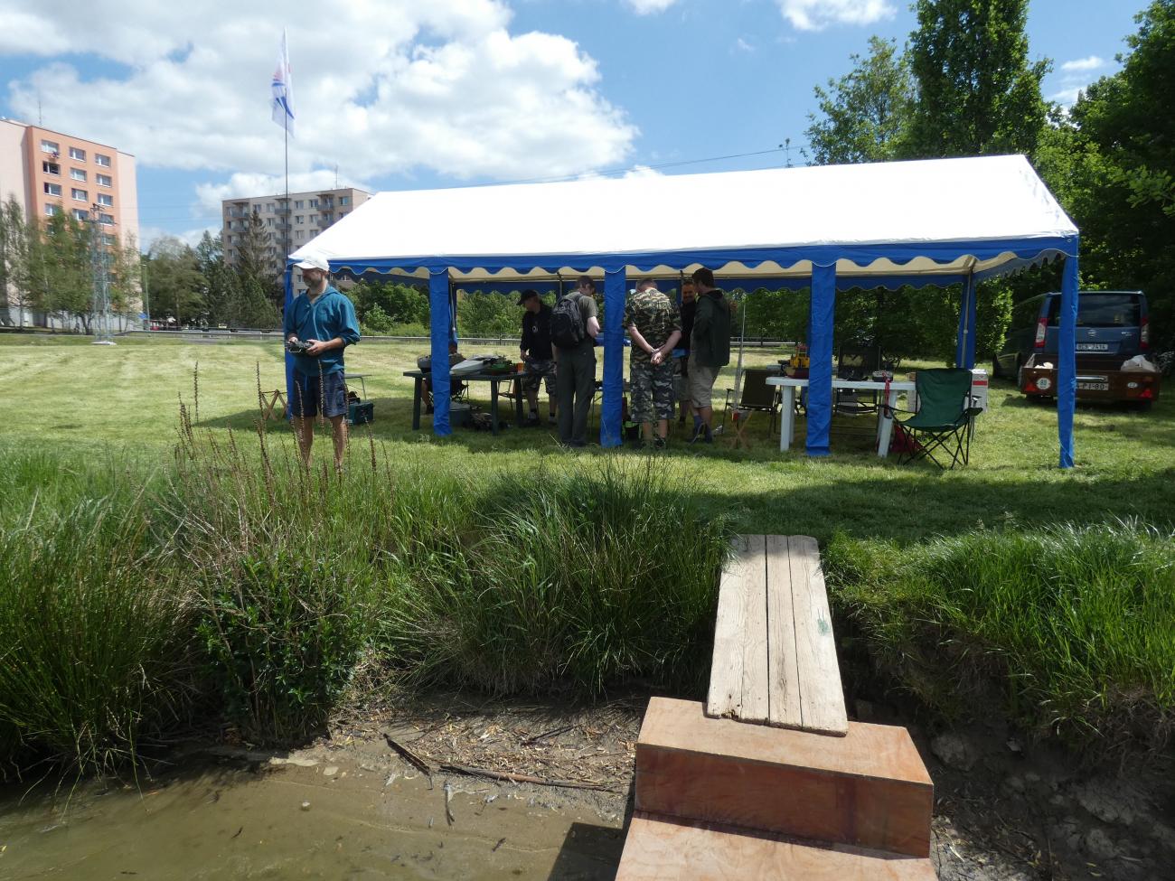 První přespolní modeláři se začali trousit chvíli po desáté. Jak jsme se s některými déle neviděli, zabředli jsme do hovorů a s modely na vodu nepospíchali. Na absenci dění na vodě nás upozornil až jeden divák, a tak jsme to rychle napravili. S Bohoušem jsme nasadili plachetnice (zcela vzácně foukalo), Dejv přispěchal s remorkérem a vanou, Svenny s výletním parníkem a též byla na vodě k vidění různá rychlejší plavidla, ať už to byly různé vojenské čluny či hasičský ZAR.
