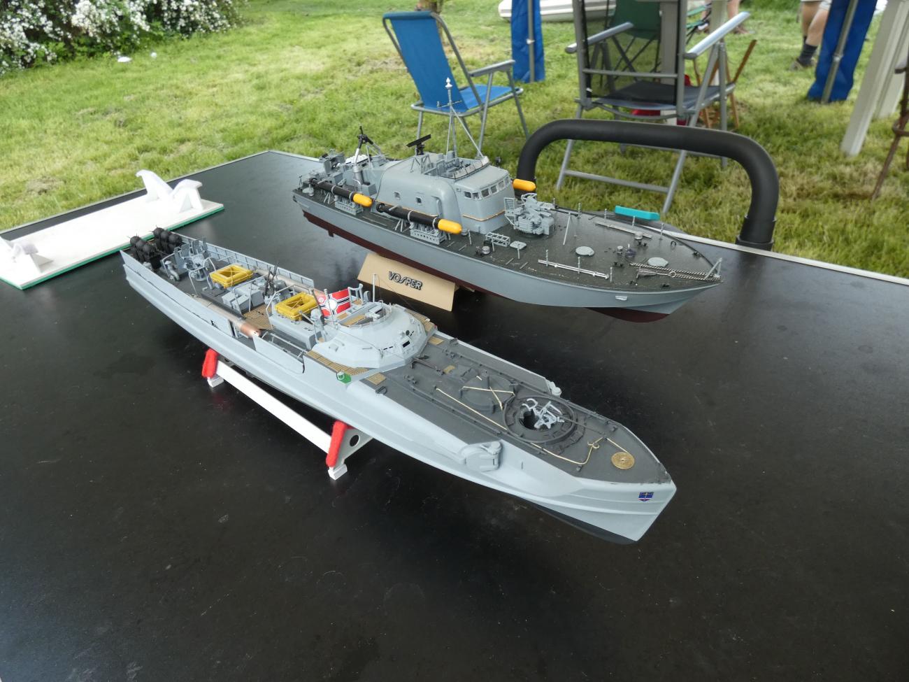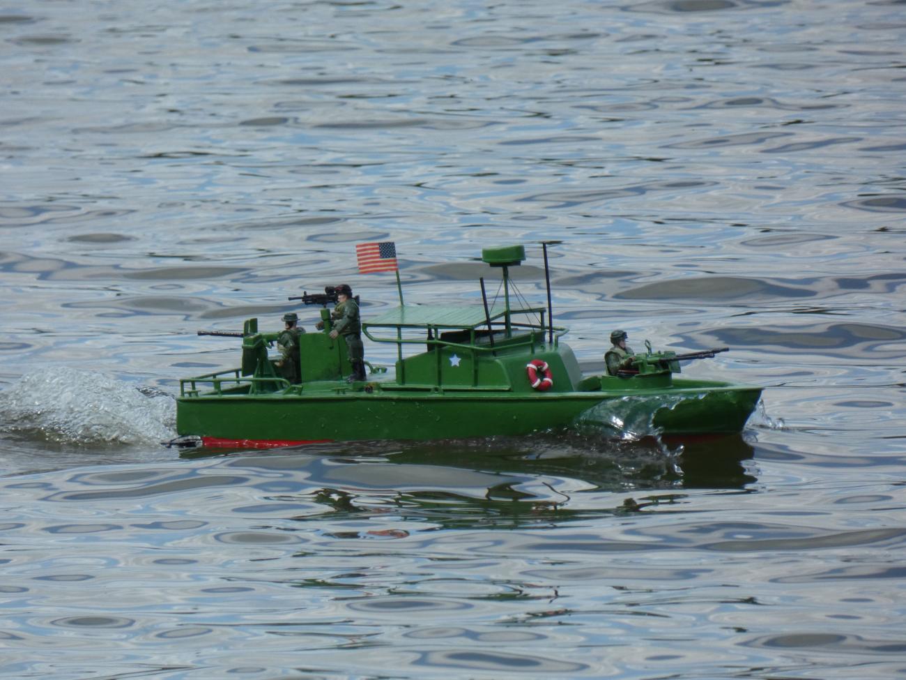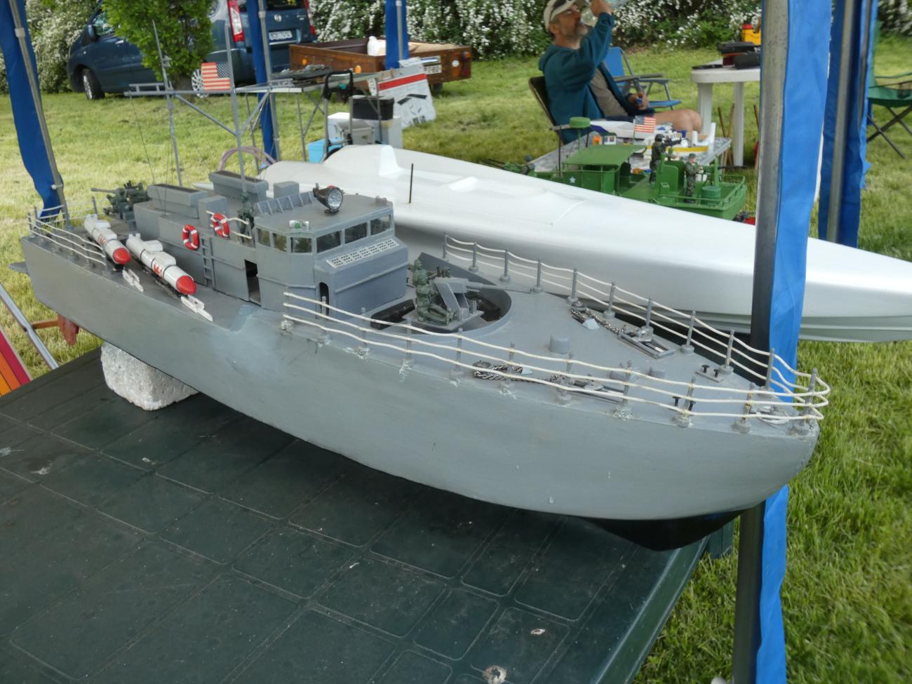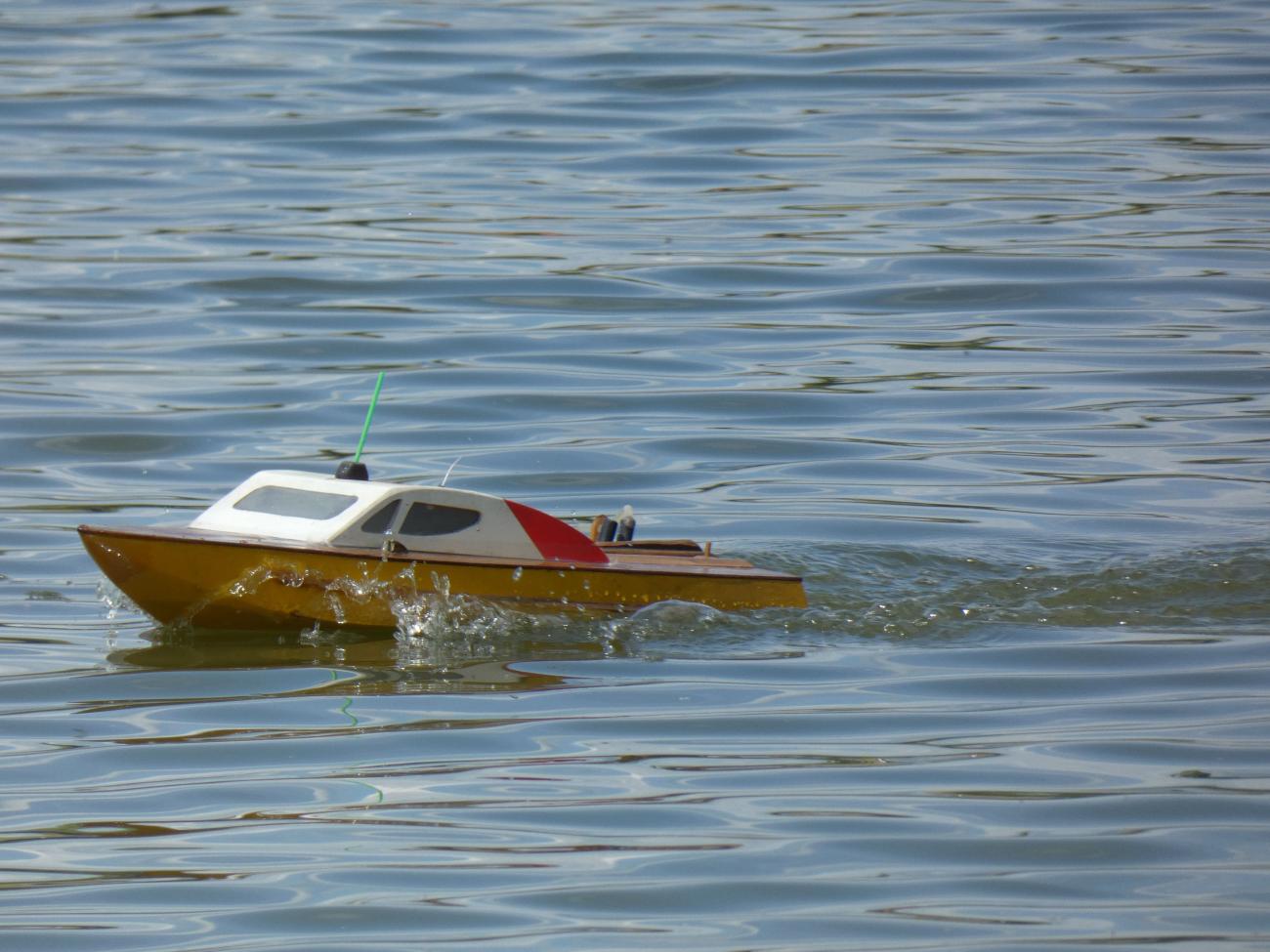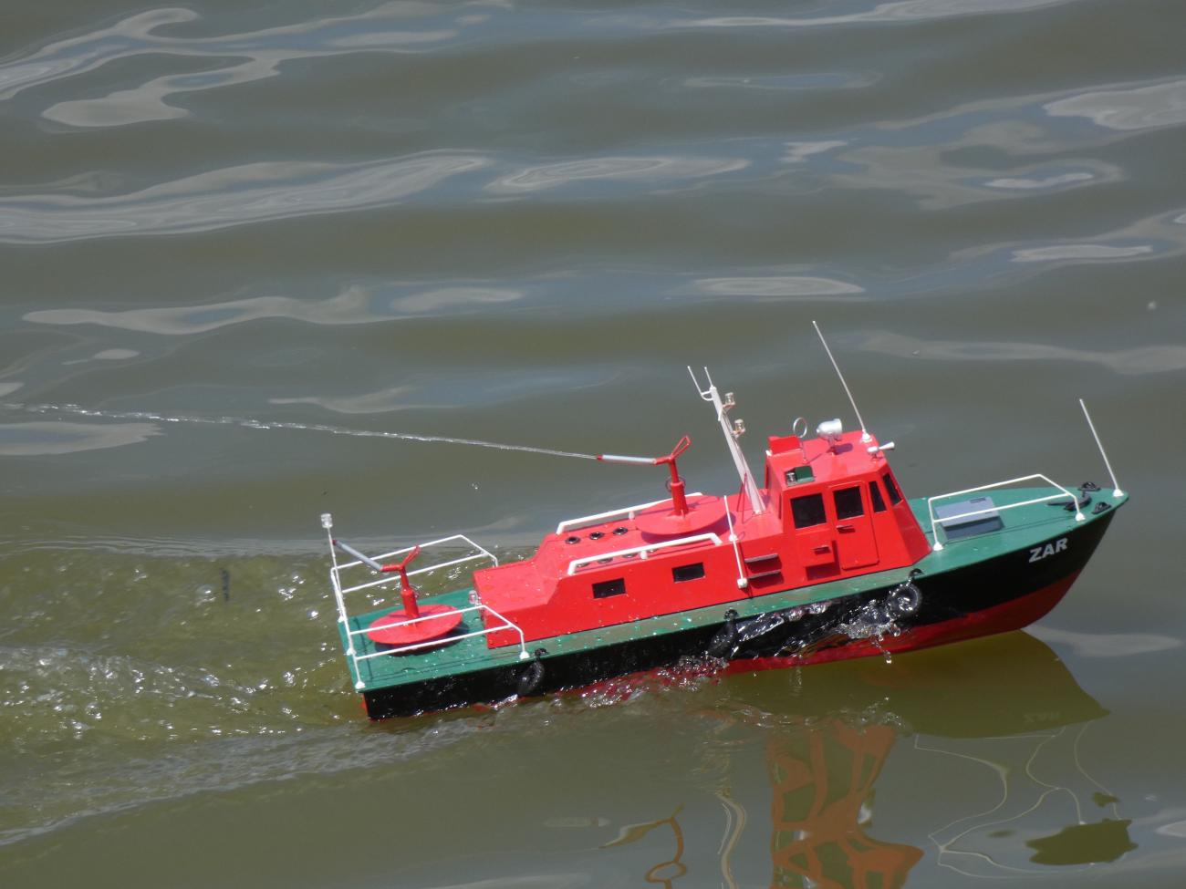 První přespolní modeláři se začali trousit chvíli po desáté. Jak jsme se s některými déle neviděli, zabředli jsme do hovorů a s modely na vodu nepospíchali. Na absenci dění na vodě nás upozornil až jeden divák, a tak jsme to rychle napravili. S Bohoušem jsme nasadili plachetnice (zcela vzácně foukalo), Dejv přispěchal s remorkérem a vanou, Svenny s výletním parníkem a též byla na vodě k vidění různá rychlejší plavidla, ať už to byly různé vojenské čluny či hasičský ZAR.