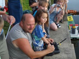 Po obědě druhé jízdy. Těsně před jízdou jsem zjistil, že jsem někde urazil jednu z dýz. Popadl jsem vteřiňák, aktivátor a bleskově přilepil, bohužel i k trupu. Znovu utrhl trochu máznul vazelínou, celou operaci jsem zopakoval a na start. V druhé brance jsem zjistil, že mám plán špatné trati, šáhnul po plánu co měl Ivvo a můj mobil za všeobecného pobavení zmizel pod hladinou. Druhou branku jsme úspěšně zvládli a pak náhle moje Monako uhnulo nekontrolovaně doprava. Asi jsem to nepřilepil moc dobře a dýza ulítla. To se však nepovažuje za havárii a tak jsme jeli jsme dál. V půlce trati jsme měli na kontě už 6 trestných bodů, protože loď neustále uhýbala prudce do strany. Náhle se zastavilo i Ivvovo Monako a museli jsme ohlásit havárii. Pavel se neohroženě jako už poněkolikáté (nechápu proč vůbec z té vody vylézal) ponořil do vln a jal se nás zachraňovat. Ze zadního remorkéru vytáhl chuchvalec řas a při té příležitosti prohlédl i přední a vytáhl ze šroubu další řasy, dýza byla přilepená dobře. Od té doby bylo vše v pořádku, i když jeden bodík jsme si ještě připsali. Děkuji všem, kteří mezitím hledali můj mobil, byl nalezen a zemřel za vlast.
