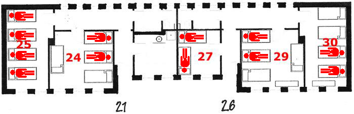 Každý vchod má společné 1xWC a 2xumyvadlo (studená voda). Sprchy a teplá voda jsou k dispozici