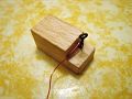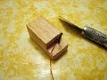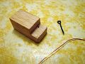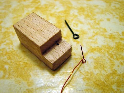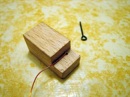 U přípravku je důležitá ostrá vnitřní hrana, u které vyvrtáme naproti sobě dvě díry. Jedna odpovídá průměru našeho drátku a délce "nožičky" očka. Druhá slouží pro čep, okolo kterého motáme očko. V mém případě má drátek 0.4mm a čep je z běžného pozinkovaného vázacího drátu 0.8mm.