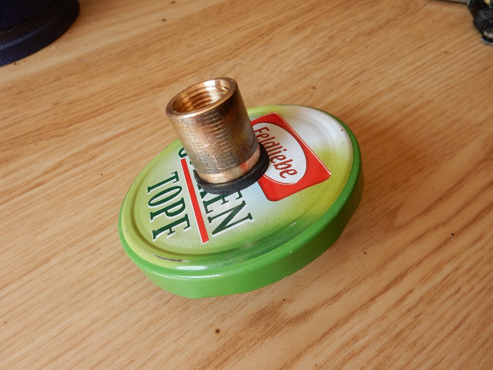 Průchod plechem víčka sklenice, bude nutno z obou stran utěsnit. Na tato ½” prodloužení padne gumové těsnění o rozměrech, které jsou patrné z obrázku níže.