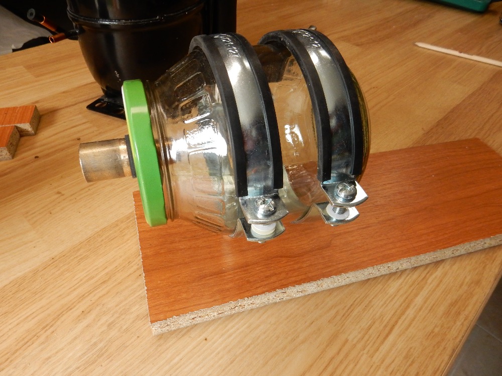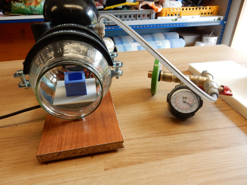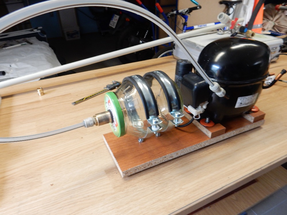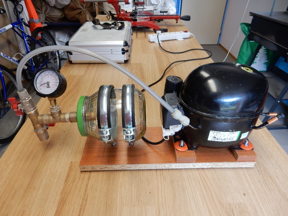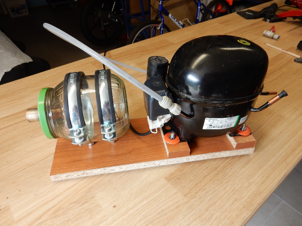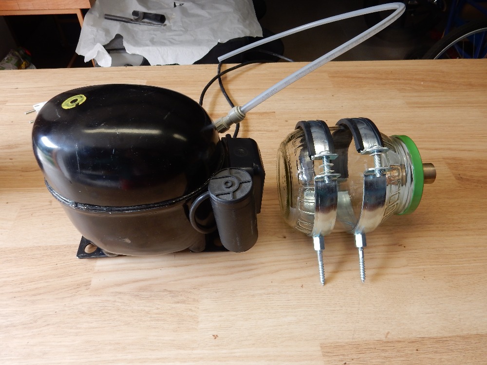 Dalším základním prvkem je zařízení vytvářející podtlak. Stejně jako použití sklenice na podtlakovou nádobu, je zde nejvhodnějším zařízením kompresor ze staré lednice. Jsou dostupné, staré a ještě funkční lednice se sehnat opravdu dají. Servisy chlazení rovněž pomohou.