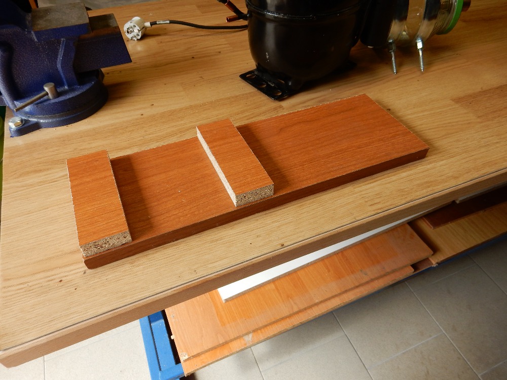 Nyní jsem dřevěnou základnu uřízl a zároveň s ní i dva pásky. Důvodem je skutečnost, že tělo vlastní tlakové nádoby kompresoru je směrem dolů „bachratější”, než jsou jeho upevňovací prvky. Původně je totiž kompresor upevněn na 4 ks silentbloků, které u mého kompresoru nebyly. Získáte-li jej s kompresorem, nemusíte pásky vytvářet.