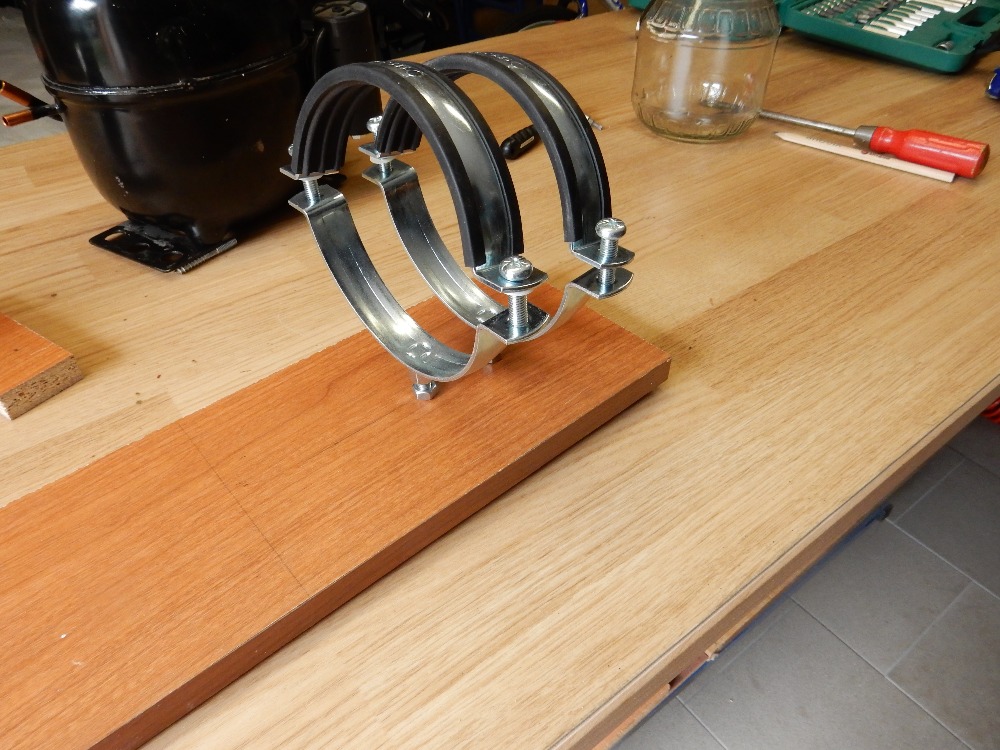 Dalším úkolem je sklenici upevnit na podložku. Způsobů je mnoho, jsme modeláři, tak to není problém. Já jsem nehledal žádná složitá řešení a výroby. Změřil jsem průměr mé sklenice a hledal jsem v komerčně vyráběných objímkách. Tyto objímky jsou tzv. „dvoušroubové s gumou”.