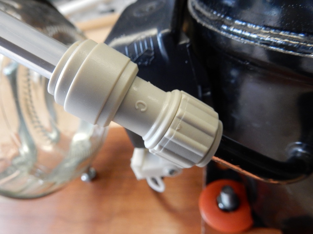 Pokud bychom v tomto okamžiku našroubovali do připraveného prodloužení na víčku sklenice redukci 3/8” – ½” a do ní plastovou koncovku s hadičkou, jsme hotovi. Ovšem v té nejjednodušší podobě. Takto nejsme schopni podtlak ve sklenici sledovat, kontrolovat a při vypnutí kompresoru podtlak přes něj může klesat.