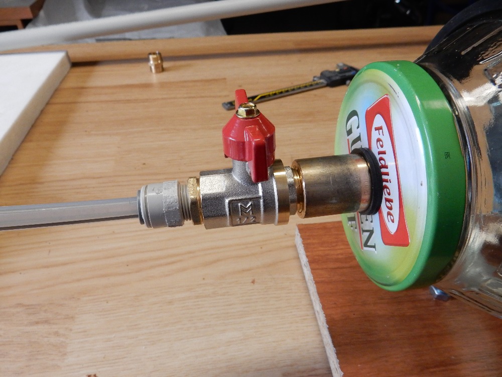 Řešení je opravdu neandrtálské. Mírného zlepšení dosáhneme, pokud mezi plastovou koncovku a prodloužení vložíme kulový uzávěr ½” ve variantě jeden závit ven, druhý dovnitř. V tomto případě můžeme po vyčerpání vzduchu ventil uzavřít a podtlak ve sklenici lépe udržet. Problémem ovšem stále zůstává nemožnost tlak sledovat a problém je i s vypuštěním podtlaku při otvírání sklenice.