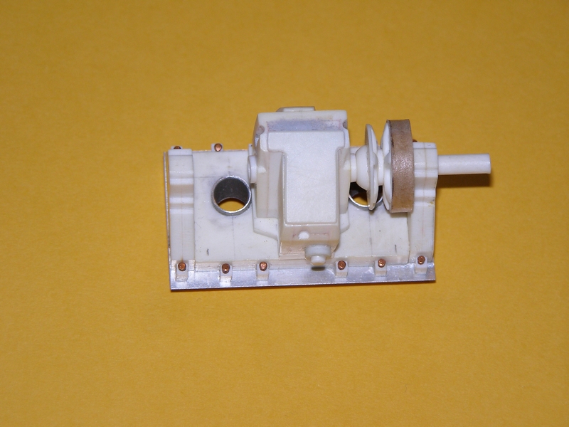 Obě brzdy na vrátku jsou znázorněny hliníkovými pásky + nýty vykrojenými ze samolepicí fólie a ty větší razím z tzv. pérek do papírových složek. Celá mechanika brzd, dokud jsem ji nezajistil lepidlem a barvou, chodila!!
