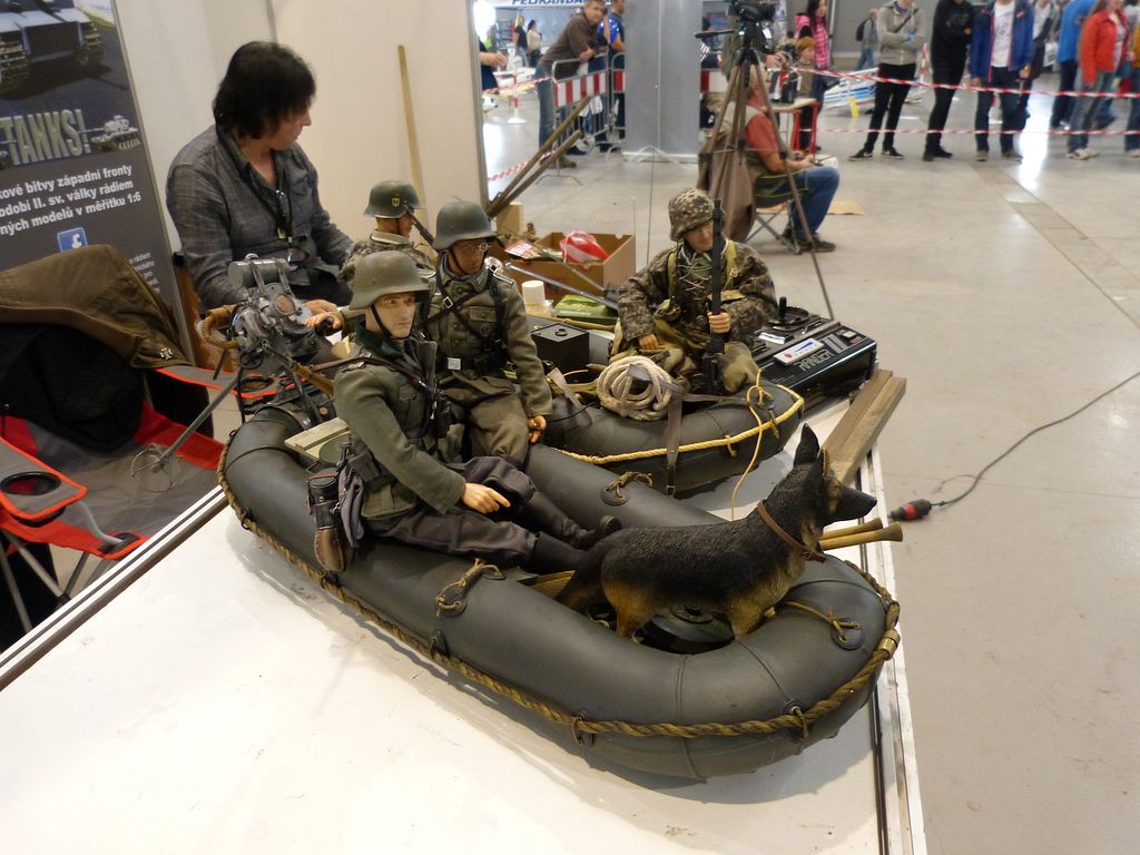 Sice píšu hlavně o lodích, ovšem po příchodu do haly s bazénem jsem nemohl přeslechnout a přehlédnout tankovou bitvu. Kolem té se tlačenice lidí utvořila. Jinak jsem o lidi v halách s modely nezakopával. Většinou krátce nahlížím i do hal souběžných výstav, jenže to se letos nedalo. Hned u dveří té pro „počítačové pařany” byl takový nával, že jsem své úsilí vzdal.