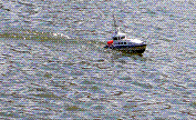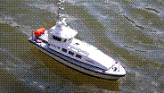 Protože mi zbylo pár diod, udělali jsme i funkční osvětlení odpovídající celní lodi. Pohonnou jednotku jsme zvolili co nejjednodušší - hřídel s přírubou pro motor řady 400 a šroubem o průměru 30 mm. Motor byl napájený z NiCd baterií 7,2 V 1000 mAh přes regulátor 30A firmy DSYS (menší jsem neměl). Loď jsme osadili jedním servem pro kormidlo, tedy otočnou kortyho dýzu, která předurčovala dobré jízdní vlastnosti i při couvání u lodě s kolmou zádí. Jak jsem stačil vypozorovat, loď jezdila celkem svižně. Při couvání se potvrdil předpoklad s kortyho dýzou.