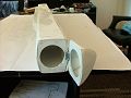 Je potrebné aby hrany spojov dna boli zabrúsené pod uhlom približne 45 stupňov čo zabezpečuje v ďalšom kroku vodotesnosť trupu. Tu by som odporučil aby pri lepení spodných dielov bola do rebier zasunutá odpaľovacia komora, ktorú tvorí trubka o priemere 75 mm. Tu som použil odtokovú trubku. Jej dĺžka je 80 mm. Táto zabezpečuje dostatočnú dĺžku k bezpečnému odpalu rakety V-2. Pokiaľ je súosovosť už vytvoreného trupu v poriadku.