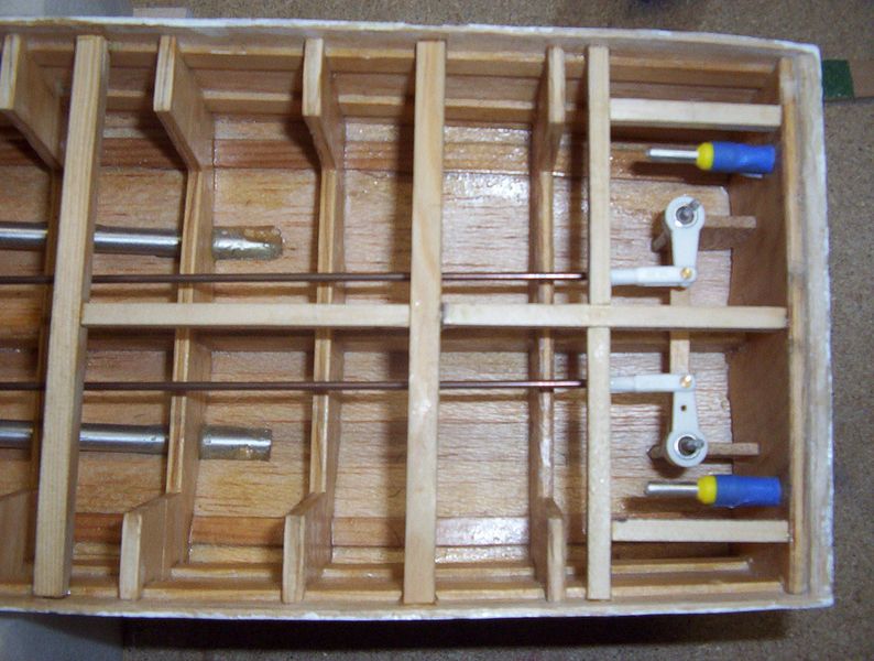 SH: Táhla jsou ze svařovacího drátu, umístění serva v pohodě - mám tam udělané kryty hřídeli, jen nejsou ještě na fotkách. Servo je rychle demontovatelné. Ale stejně je díky úzkému tvaru do trupu přístup jak k penězům. Pozdra kormidel mají na koncích ''objímky'' vyrobené z podložek stejného vnitřního průměru ( taky ještě nejsou na fotkách ).