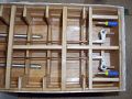 Když bylo vše zalepeno na svém místě, mohl jsem přistoupit k povrchové úpravě. Nejprve jsem balzu zvenčí důkladně napustil pryskyřicí. Nejprve zředěnou, pak hustou. Když byla pryskyřice za dva dny tvrdá, nahrubo jsem trup přebrousil a začal tmelit dvousložkovým polyesterovým tmelem. Nejprve zrcadlo, poté i zbytek.