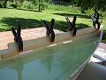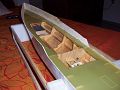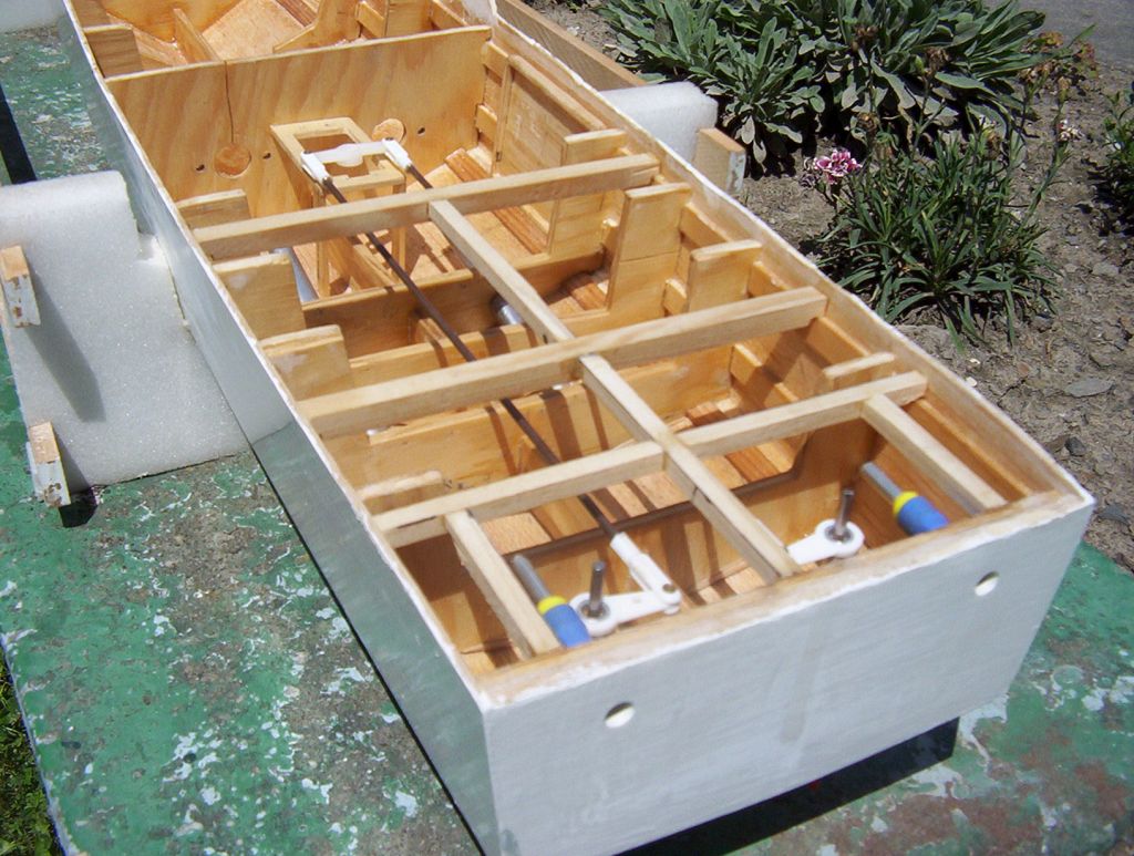 Ještě před samotným vlepením bylo ale nutno udělat něco, na co bych palubu přilepil. Samotné žebra se ukázaly jako nedostačující a paluba se prohýbala. Proto jsem na zádi a na přídi, kde už nezasahoval středový otvor, udělal jakýsi rošt ze smrkovích hranolků, který palubu podpírá.
