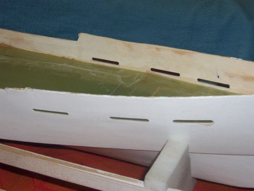 Když byly otvory hotovy, tak jsem zdrsnil a na svá místa vlepil vzpěry, opět epoxidem. Po zaschnutí epoxidu jsem bort nahrubo obřízl podle vzpěr a pak přesně zapiloval do roviny s hranami vzpěr. Z laminátu jsem si připravil „obdélníky“ ve tvaru vrchní části bortu s přesahem. Tyto jsem pak postupně epoxidem lepil ke vzpěrám a dolní části bortu. Když bylo vše na svém místě, tak jsem vzal desku s nalepeným šmirglem a zarovnal jsem nejdřív spoj dvou částí a pak vrchní hranu. Tak aby byla zarovno se vzpěrami.