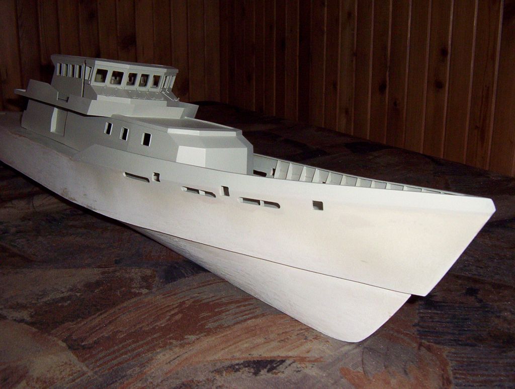 Jako další věc jsem musel nalepit palubu. Z lamitecu jsem objednal desku laminátu 0,76mm. Přesně na začátku prázdnin se před chalupou objevila bílá dodávka kurýrní služby a usměvavý chlapík mi podal rozměrný, ale tenký balík. Celý rozjařený jsem jej rychle odnesl domů, s krásnou vidinou prázdnin strávených v garáži, s rukama usmolenýma od epoxidu a zaprášenýma od pilin laminátu. Jestli si pamatujete, tak než jsem potahoval boky trupu, tak jsem si udělal balzovou šablonu paluby. Tu jsem vytáhl ze skříně a jal se překreslovat lihovkou tvar na laminát. Posléze jsem palubu vystřihl nahrubo nůžkami a obrousil do finální podoby. Vzhledem k tloušťce laminátu se velmi pěkně stříhá a brousí. Ještě zbývalo vyříznout otvory pro přístup do trupu ve tvaru nástavby. Po zdrsnění obou stran šmirglem byla paluba připravena k nalepení.