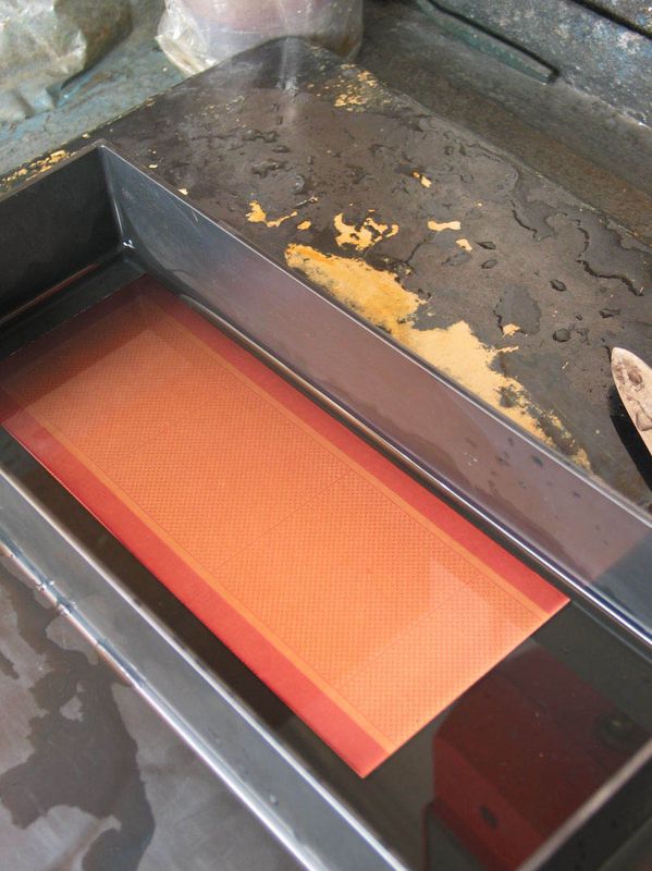 položíte na povrch roztoku měděnou stranou dolů tak, aby se měděná odleptaná část uvolňovala směrem ke dnu nádoby. Jinak dojde k nestejnoměrnému odleptání. Během procesu desku vyjměte a
