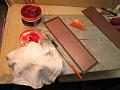 Budeme potřebovat zhotovenou matrici, vazelínu, seříznutý štětec, já používám epoxyd 1200, skelnou tkaninu 35-45 g, dvě tabulky skla, nádobu na míchání epoxydu, špachtličku, něco pro obarvení
