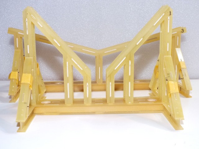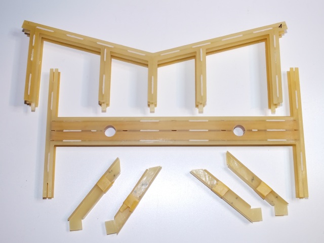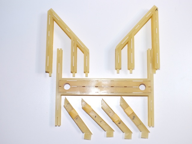 K lepení jsem použil vteřinové lepidlo, které jsem postupně nanášel do rohů konstrukce. Celá konstrukce je vyfrézována ze sklolaminátové desky tloušťky 1 mm a díly byly doplněny zámky jednodušší ustavení a pro následné lepení. Na krajích konstrukce budou doplněna montážní oka z drátu o průměru 1 mm.