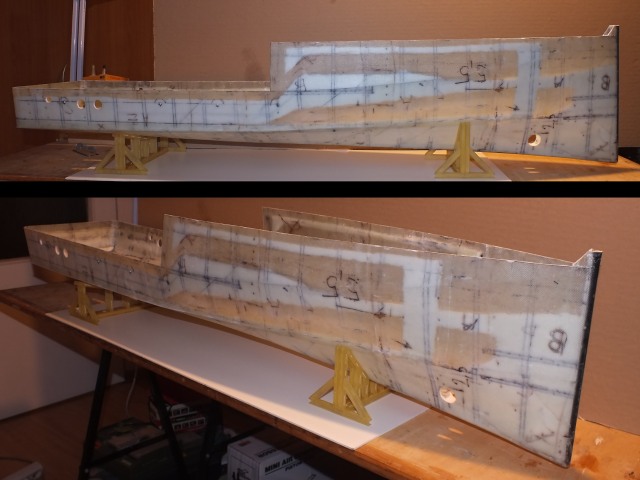 Vzhledem k netradičnímu trupu lodi jsem nechtěl použít plný profil stojánku. Pro vytvoření stojánku lodi jsem jako předlohu zvolil konstrukci, která se používá při vytažení lodi v suchém doku.
