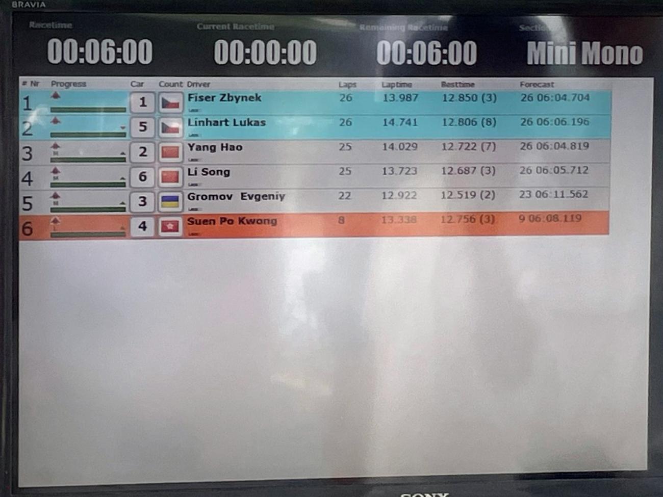 U našich seniorů byla vidět hodně vyježděnost jak v přizpůsobení rychlosti podmínkám na trati, tak spotřebě elektrické energie, která je hlídaná limitérem. Na základě svých zkušeností se snažili i jemně doladit nastavení a vyvážení modelů tak, aby se s ním dalo za daných podmínek co nejlépe jezdit. Ve většině rozjížděk vyhrávali závodníci striktně si držící ideální minimální ovál okolo bójí vytyčujících trať a pravidelnost tempa. To se zúročilo zejména ve finálové jízdě Mini Mono, kdy po ideálním startu Zbyněk Fišer zaujal první místo, o které sice po asi šestém kole přišel po odhození na vlně od předjíždějícího modelu. Vrátil se však ke svému pravidelnému vykružování nejmenšího oválu a šetření výkonu i na rovinkách a tím se postupně přiblížil k oběma Číňanům před ním jedoucích, a nakonec využil i svého mechanika k přesnému odhadu posledního kola. Před poslední zatáčkou využil maximálního výkonu a byl odhodlán k předjetí vnitřkem, když v krátkém okamžiku po sobě oběma Číňanům vypnul limitér napájení motoru. Zbyněk se kolem nich protáhl a dojel první do cíle. Druhý náš závodník v tomto finále Lukáš Linhart byl po ne zcela ideálním startu na posledním místě, ale v podstatě stejným stylem jízdy – pravidelné ideální ovály s omezením výkonu i na rovinkách, se postupně dostal asi 20 m za Zbyňka, a nakonec také bez aktivace limitéru projel cílem na druhém místě.