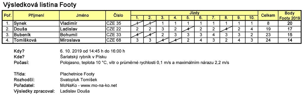 Soutěže plachetnic Footy 2019 - včetně výsledkových listin