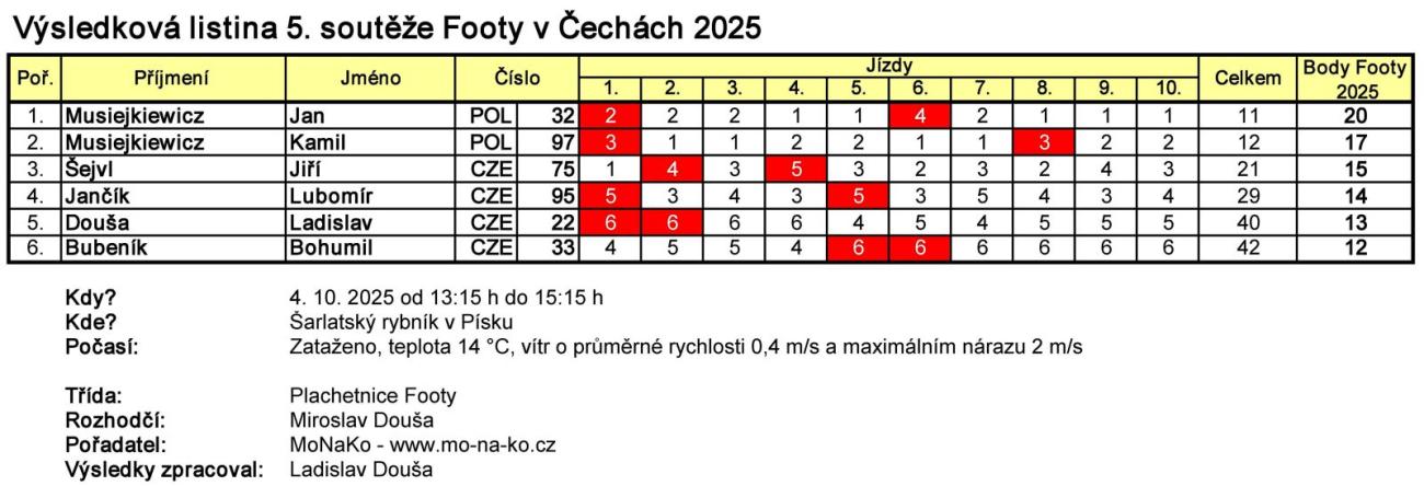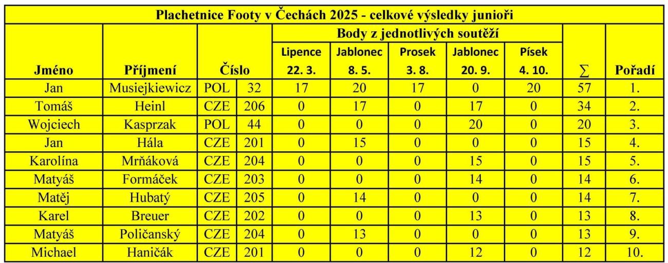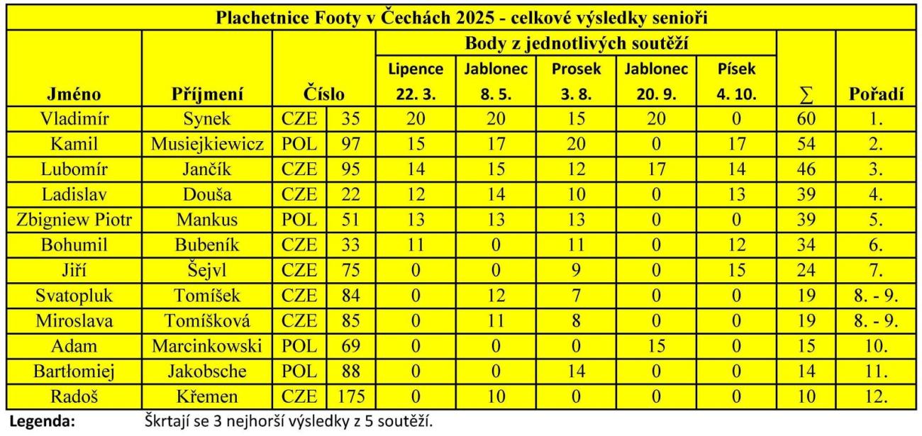 Přestože si Kamil Musiejkiewicz v Písku připsal body za druhé místo a Vladimír Synek nedorazil vůbec, výsledky seriálu soutěží Footy v Čechách 2025 to již neovlivnilo. Z 12 soutěžících seniorů byl nejlepší Vladimír Synek. Druhý skončil Kamil Musiejkiwicz a třetí Lubomír Jančík. Sám jsem se díky účasti na 4 soutěžích udržel na čtvrtém místě, když všichni ostatní vyrazili maximálně na tři.