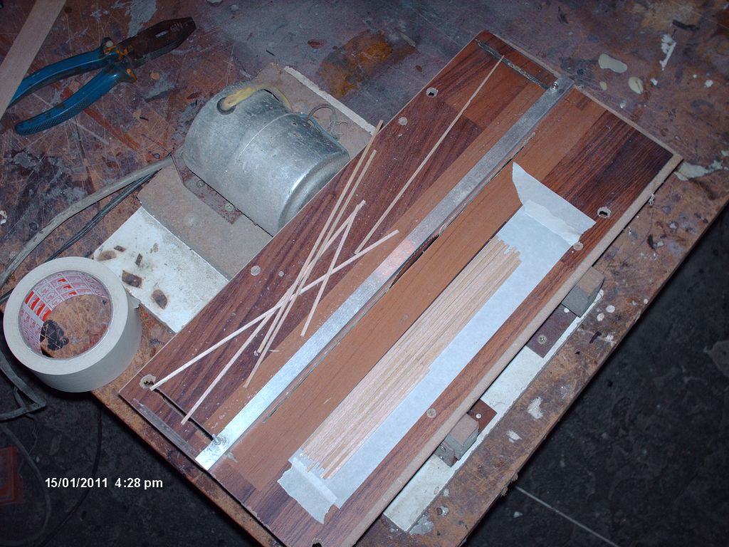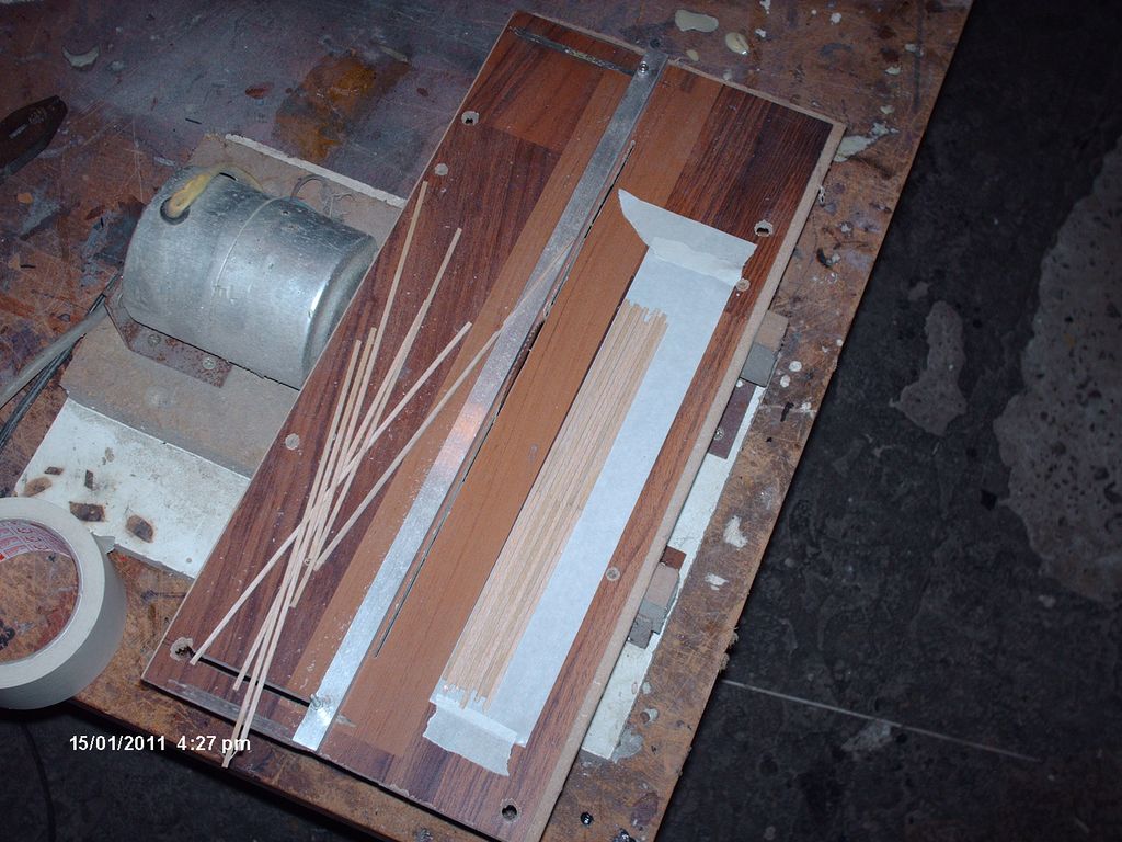 Narezané "palubky" z balzy ( potrebnej dlžky, ktorá zodpovedala plánu aby sa dosky dali modelovo nadpájať) boli na "kant" ( kratšiu stranu ) nalepené čo najtesnejšie vedľa seba na lepiacu pásku a stiahnute spolu zvierkou (v núdzi páskou).