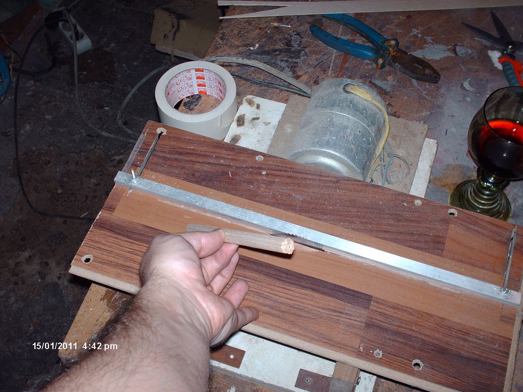 První bod je, použít co největší zuby na pilovém kotouči pro zajištění co největších otřepů na řezu. Prkénko je balza síly 2 mm a na pile byla nařezána na proužky 3x2 mm.