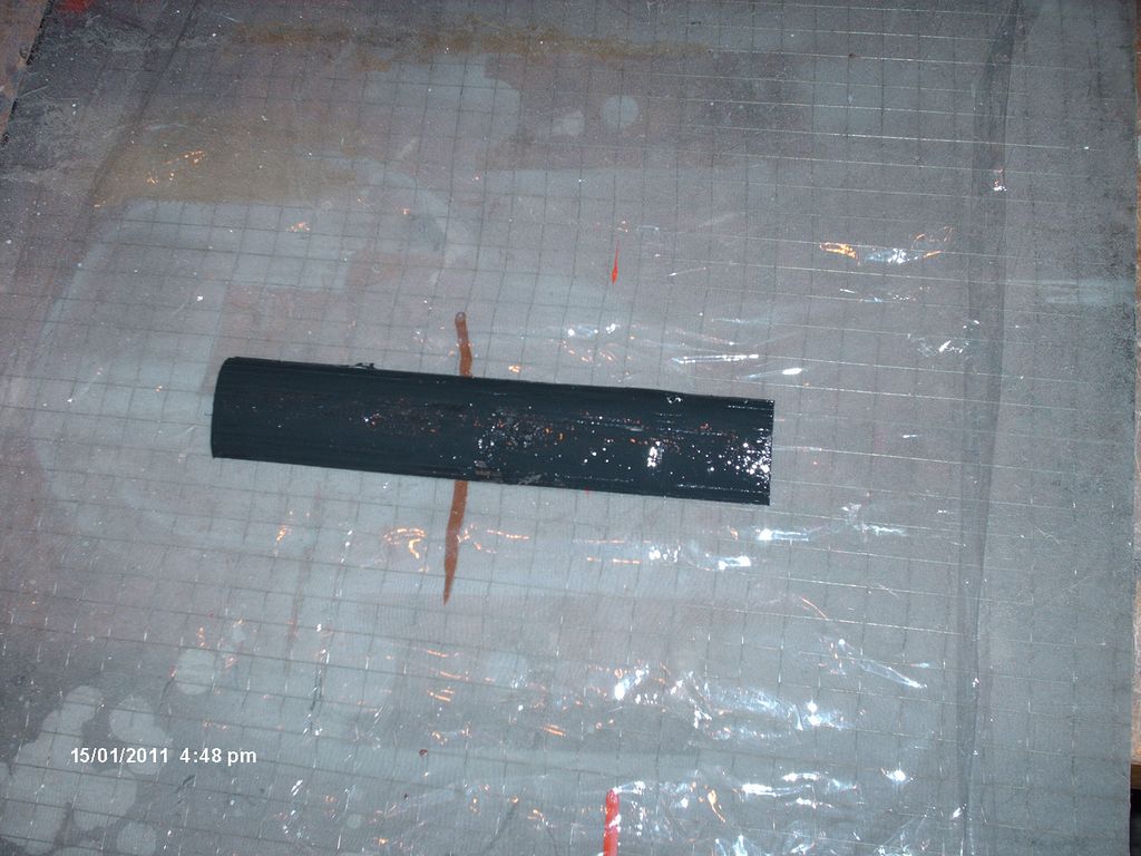 Obrázek 13 Dále popisuji jen případ se skelnou tkaninou, překližková podkladová verze se však neliší v dalším zpracování. Celek po přitlačení dám zaschnout mezi 2 pevné desky stažené třeba svěrkami, na fotkách je to vidět mezi stolní deskou a kouskem lamely plovoucí podlahy, a to tak, že z obou stran mám na polotovaru paluby tenkou potravinářskou folii (Obr. 13).