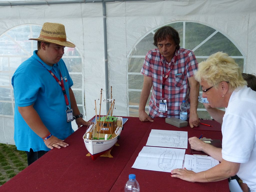 Ve vedlejším stanu začíná ve stejnou dobu bodování NSS-A, zde nejprve vzhledem k počtu lodí – 10 juniorů, 12 seniorů dochází k rozdělení na juniory a seniory, takže úplně první ze všech je na řadě Tomáš Jakeš s Amati (78,33b), obdrží několik připomínek ke sklonu špičky a výztuhám plachet. U plachetnic byl posuzován jen vzhled a shodnost s podklady na vážení a přeměřování plachet pokud jsem si všiml, nedošlo. K zajímavému prošetřování došlo hned po nástupu juniorů, u Rusky Raisy Basiny se objevily pochybnosti, zda je ještě juniorkou. Nakonec nepředložila nějaký osobní průkaz, ale Basin přinesl nějaké prohlášení na hlavičkovém papíru ruského svazu a Raisa byla juniorkou. Po plachetnicích NSS-A mělo na stejném místě od čtyř hodin začít bodování F4B seniorů. V tuto dobu rozhodčí NSS pomalu končili s juniory a ještě je čekali senioři, ale s plachetnicemi se stejně pod stan nevešli, takže nakonec bodování F4B nepřekáželi. NSS-A senioři, zde máme jednoho zástupce s velkou historickou plachetnicí Endeavour Milana Kroupu, která pak na vodě oproti modelům moderních rychlých plachetnic nemá moc šancí. Bohužel už ani poctivá „dřevěná“ modelařina nepůsobí na rozhodčí natolik, aby alespoň v hodnocení stavby přeskočily moderní plastové výtvory, takže získává jen 88b oproti 97,3b za moderní plastový New Zealand.