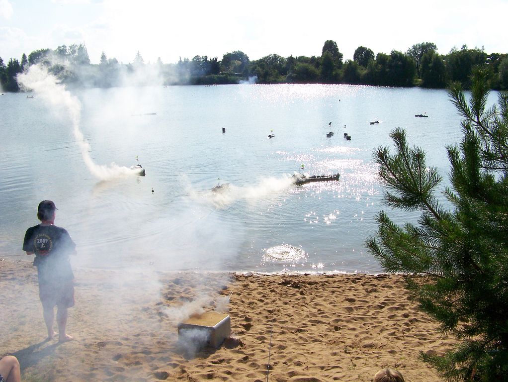 Vybaven Springerem, jenž je mým doposud jediným osvětleným modelem, jsem v odpoledních hodinách vyrazil se značným časovým předstihem, abych na místo činu dojel o něco dříve. Nakonec jsem tam tak brzo nedorazil, takže už u vody bylo celkem živo. K mému překvapení tam však bylo více diváků, než modelářů. Každoročně se opakovalo to, že všichni v podstatě jezdili ještě za světla a s nastupující tmou hladina řídla, až jsem kolem desáté vyklidil pole i já – jako poslední! Nicméně deset osvětlených lodí na vodě naráz bylo (i jedna plachetnice), takže docela úspěch. Ještě jsme si krátce popovídali u aut a vyrazili jsme. K našemu překvapení se nám do cesty postavila místní městská policie a jala se vyšetřovat, cože to tam provozujeme. Nevím, zda jsme se o tuto nezvanou návštěvu zasloužili tím, jak Keba krásně střílel rachejtle z vody, či za to mohly nálety přítomného leteckého modelu. Už to asi nezjistíme, nicméně určitě za to mohla nějaká malichernost, jak bývá zvykem.