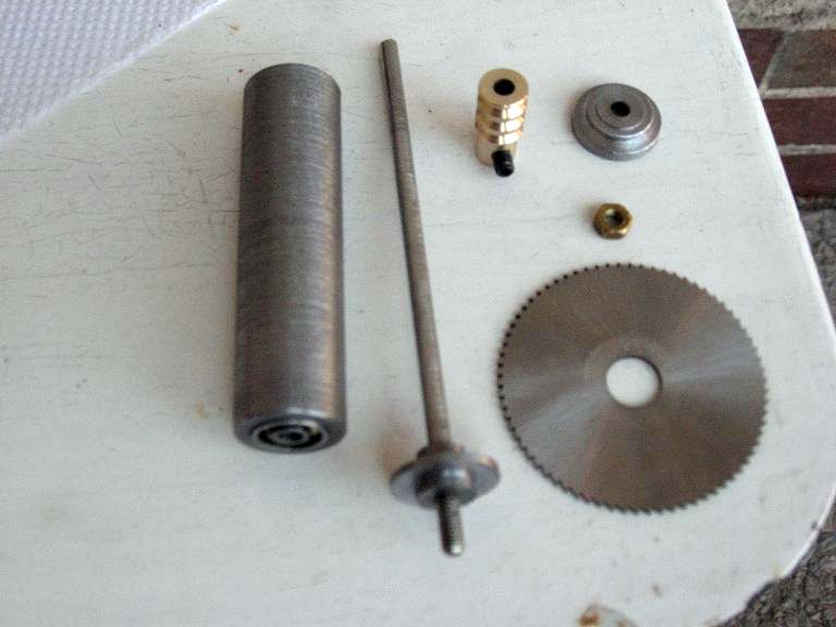 Nejdůležitější bylo vyrobit sestavu pohonné hřídele, která se skládá z trubky s ložisky, hřídele, kotouče, misek na upevnění kotouče a řemenice (obr1.jpg), sestava (obr2.jpg). Trubku na ložiska jsem vysoustružil z ocelového plného materiálu o průměru 20mm a délce 70mm, kam jsem vyvrtal průběžnou díru 6mm a vysoustružil osazení (nebo jak se to jmenuje) pro ložiska a následně ložiska ve svěráku nalisoval. Řemenice jsou z mosazi průměru 10mm s třemi drážkami pro O-kroužky (převodový poměr je 1:1). Pojištění řemenic na hřídelích je pomocí stavěcího šroubu (červíku) M4 a vybroušené plošky na hřídelích. Motor s řemenicí a hřídel s kotoučem (obr3.jpg). Pro přenos kroutícího momentu od motoru na hřídel kotouče jsem použil tři O-kroužky (já konkrétně používám 40x3 nebo 45x3mm).