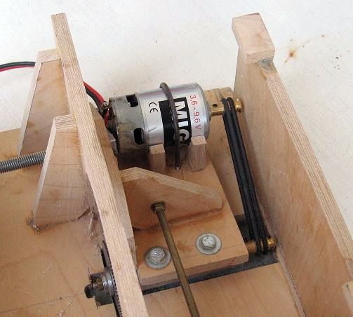 Celé pohonné ústrojí je přimontováno k „loži" z 8mm překližky, toto lože je upevněno šroubem M6 ke stolu pily. Otáčením kolem tohoto šroubu je možné měnit výšku (nebo hloubku řezu). Poloha lože je fixována ke stolu pomocí závitové tyče M8 a T-matice. Prostřední část stolu, která drží celé pohonné ústrojí proto musí být dostatečně tuhá. Celkový pohled na kotoučovou pilu (obr4.jpg) a pohled do „strojovny" (obr5.jpg). Na pilu ještě dodělám nějaké ty pravítka atd. (až bude čas).
