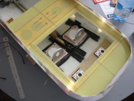 Do trupu jsem zabudoval lože motoru a sokly pro dýzy. Lože motoru jsem pro jistotu poprvé osadil špatně a stálo to dvě hodiny vybrušování zhruba 100 g Letoxitu na balkoně. Vysokootáčková bruska s brusným kotoučkem a hlavně její zvukové projevy iritovaly některého obyvaletele v okolí natolik, že ho to dohnalo ke střelbě z airsoftové zbraně směrem na náš balkon. Střelce jsem neodhalil, ale vydržel a dobrousil. Okolí lože pro motor je vyztužené opět uhlíkovým rovingem a později při testech dýz bylo toto zesílení ještě rozšířeno až za sokly dýz, protože hmotnost a způsob uložení motorů (900 Graupner) a dýz musí opravdu tuhé. Nedostatečná tuhost měla vliv na proudový odběr.