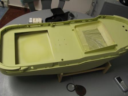 Nástřik paluby - syntetická barva - nebylo zrovna nejvhodnější řešení neboť zvolený způsob utěsnění krytu nad motory - přelepení elektrikářskou páskou - je vysoce funkční, ale syntetická barva se začala loupat. Později jsem část barvy okolo krytu odstranil a nastříkal akrylátovou barvou s tužidlem namíchanou u autolakýrníka. Spodní část trupu je taktéž stříkaná syntetikou a tam je docela vhodná.