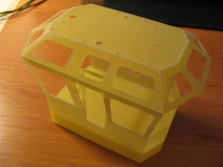 Trochu jsem se obával laminování trupu, protože tuto práci jsem ještě nedělal (doposud to byly trupy plaňkované), ale na Monaku je dost odkazů a poučení. Zvolil jsem pozitivní laminaci a kopyto vytvořil z Extruporu - žebra ze 6 mm a obšívku ze 3 mm. V místě, kde budou otočné dýzy ("Z pohony") jsem vložil 3 mm překližku pro zvýšení pevnosti. Obšívka je lepená Purexem. Vlastní laminování bylo provedeno pryskyřicí Letoxit a čtyřmi vrstvami skelné tkaniny (90, 120, 120, 90) zvenku i zevnitř. Část trupu u kýlu byla vyztužena uhlíkovým rovingem. Extrupor byl zhruba po úroveň čáry ponoru zanechán v trupu a výš vybroušený, tak aby paluba byla uchycena na "plném laminátu" a současně bylo možné vylaminovat borty. Stěna trupu je tedy cca. 1 mm laminátu - 3 mm extrupor - 1 mm laminátu a borty cca. 2 mm laminát.