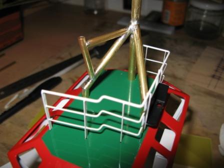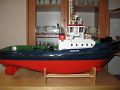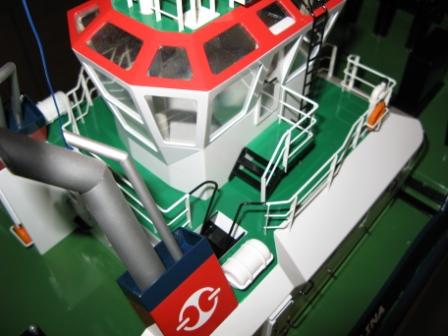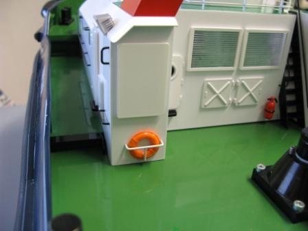 Zadní a střední část paluby je vyrobená z 1 mm laminátu a přilepená Letoxitem s mikrobalony (tedy řádně odspodu opatlaná). Přední část paluby je ze 4 mm překližky polepené 1 mm laminátem. Byl to sice zásah do hmotnosti lodi, ale tato část paluby současně složí pro ukotvení příďového úvazníku a tak mně to připadalo vhodné. všechny "dřevěné díly" jsou řádně natřené Letoxitem. Na střední části paluby byl vyroben límec pro uchycení nástavby a pak už byly třeba vyrobit domečky pro oděrné lišty a přední a zadní odrazníky. Domečky na boku jsou z 1 mm laminátu vypižlané do tvaru trupu přilepené vteřinovým lepidlem a následně vylité epoxidem s vložením naseparovaného kruhového gumového profilu. Pro separaci byla použita pasta na parkety.