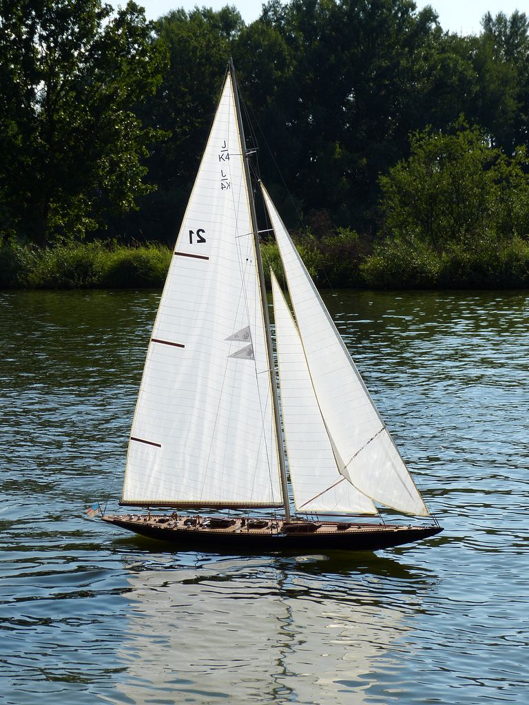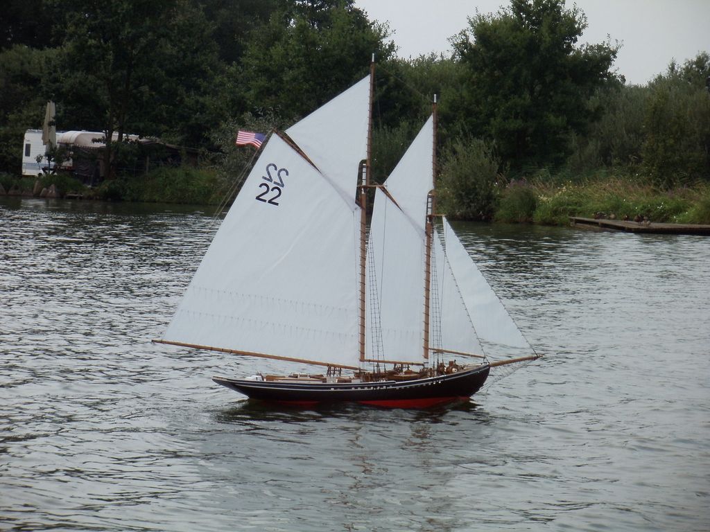 S údivem jsem sledoval, jak si model na své první plavbě povede. Netrvalo dlouho a na bubnu navijáku se zamotalo kevlarové rybářské lano. Jak mi pravil prodavač, udrží stokilového chlapa. Proto není divu, že se mosazný drátek, ztvárňující zavěšení karabiny hlavní plachty, bleskově narovnal. Ještěže tak, také se mohlo stát něco horšího.