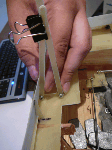 Tyto tři díly jsem spojil pomocí dvou šroubů, dva konce jsem nechal nesešroubované, abych mohl měnit úhel. Nenašel jsem žádné
