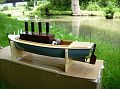 Trup modelu má celkovou délku 77cm, tedy o 10cm více než předešlý. Je postavený stejně, žebra a kýl z překližky 5mm a plaňky 2x5mm. Strojek jsem posunul duzadu oproti nákresu, takže zmizelo kormidelní kolo. Detaily (úvazníky a záchranná kruh) jsem vynechal, loď je stejně s tímto kotlem a pohonem maketově úplně mimo. Barevnou úpravu jsem volil co nejjednodušší. Dával jsem si pozor hlavně na materiály použité na stavbu trupu, protože se během jízdy i on celkem dost zahřívá. Kormidlo se ovládá řetězy s pružinami. Hřídel vrtule je mosazná samorobka, v model. prodejně nic vhodného neměli a tak jsem to spatlal sám. Převod je do pomala 2,6:1 ozubenými koly. K ovládání používám neustále dvoukanálovou soupravu s amplitudovou modulací.