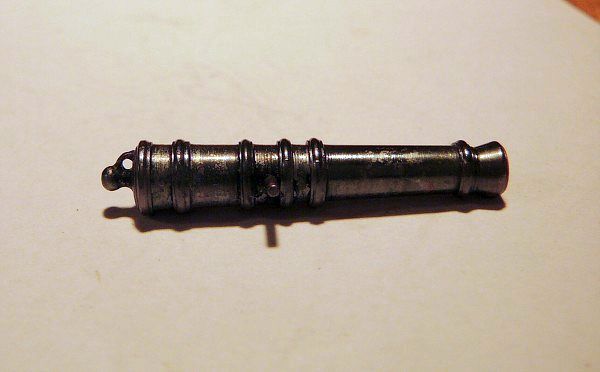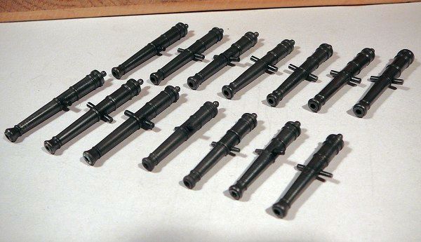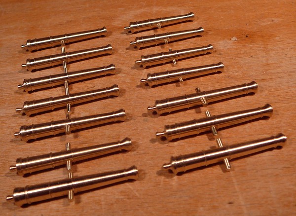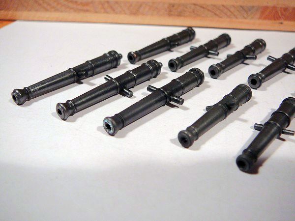 Provedl jsem i experiment s dělem ze stavebnice (tyto bývají často v nepoměru ke skutečným dělům jak rozměrově, tak tvarově). Upravil jsem průměr kulovitého zakončení děla tak,aby odpovídalo skutečnosti. Nacínoval jsem kapku cínu, opracoval a provrtal,čímž jsem vytvořil očko pro provlečení zádržného lana, tak jak bylo zvykem na anglických lodích té doby.