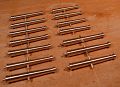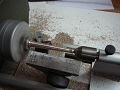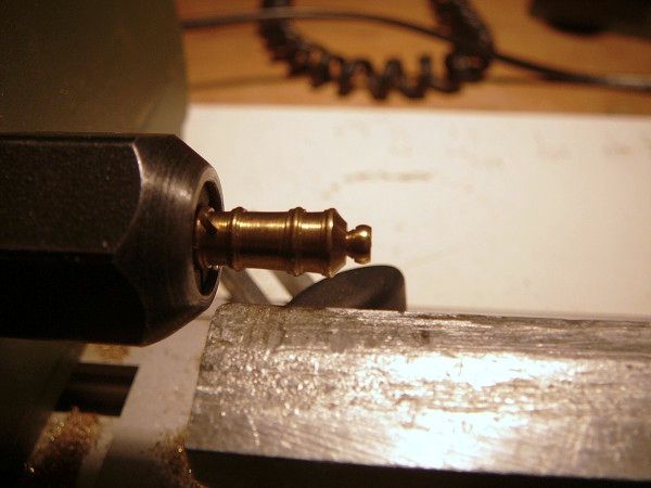 Mosaznou kulatinu jsem nahrubo osoustružil do krajních průměrů, podle podloženého výkresu jsem označil místa prstenců a stočil na průměry. Nakonec jsem snížil části hlavně mezi prstenci, vyleštil čtyřstovkou smirkem a vytočil jsem kuličku (Button) na konci děla. Ve svěráku vrtačky doraz,(ti kteří si moc nevěří, si mohou vyrobit pomocné čelisti třeba ze dřeva, do kterých vloží hlaveň děla na vrtání otvoru pro čepy), aby vrtání otvoru pro čepy bylo na všech hlavních stejné, vytočil čepy z mosazné kulatiny a narazil je do hlavní. Pokud by se jednalo o větší počet děl stejných rozměrů, pak by se vyplatilo vybrousit si profilový nůž, ale při deseti kusech, které jsem potřeboval, je to rychlejší od ruky a měřit.