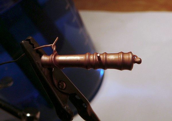 Jako zdroj proudu jsem použil rezervní nabíječku na mobil. V kádince je roztok síranu měďnatého a kyseliny sírové koncentrované. V popiscích schématického nákresu je doporučené napětí a proud, jaký je ideální pro vyloučení mědi na pokovovaný předmět. Dělo jsem uvázal na slabý drát a na drátu udělal háček tak, aby dělo po zavěšení na katodový závěs viselo zhruba uprostřed kádinky. Před pokovením jsem dělo uchycené na drátu namočil do 65% kyseliny dusičné pro odstranění zoxydovaných částí a nečistot a po opláchnutí vodou jsem je zavěsil do kádinky.(Ještě před namočením do kyseliny dusičné je lepší odstranit z dílů větší nečistoty ocelovým kartáčkem, jako třeba zoxydovaný povrch mosazného plechu ze kterého vyrobíte třeba závěsy kormidla, nebo poklopů střílen, protože kyselina dusičná silně leptá povrch mosazi a při delším ponoření by mohly tenké části zmizet). Proud jsem zapnul na zhruba dvě minuty. Po vyjmutí z lázně opláchnout vodou, usušit třeba papírovým ubrouskem tak, abych se nedotkl povrchu děla prsty a stále uvázané na drátku ponořit do patinovacího roztoku. Ihned vyjmout, nechat působit asi čtvrt minuty, opláchnout pod vodou a ponořit do neutralizační lázně z roztoku jedlé sody. Osušit, oddělat drát a hadříkem přeleštit.