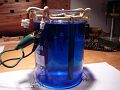 Na webu jsem si našel postupy a složení lázně, nakoupil nějaké laboratorní sklo jako kádinky, odměrku, sklenice s broušenými zátkami na chemikálie. Na litrovou kádinku jsem naohýbal z měděného izolovaného drátu konstrukci pro zavěšení anodových tyčí z měděné kulatiny u protilehlých stěn kádinky a středem závěsný drát pro zavěšování dílů určených k pokovení.
