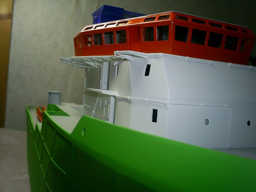 Doba letních dovolených trochu práci na lodi zpomalila, nicméně se pomaličku rýsuje podoba. Nástřik originálních odstínů barev podle předlohy a pohrávání si s detaily nástaveb a vybavení, to je nynější fáze modelu.
